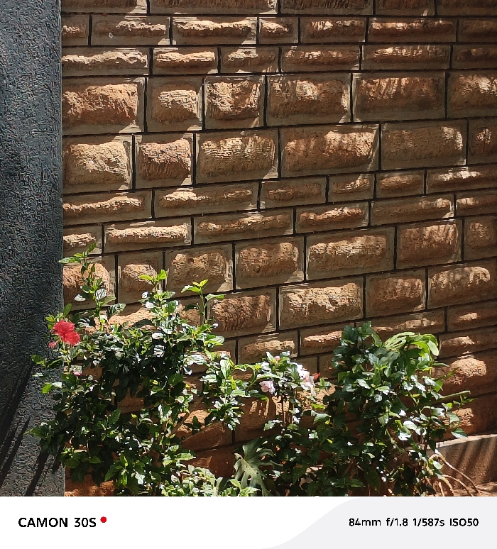 A textured, light brown brick wall serves as a backdrop for lush greenery with scattered blossoms. A single red flower stands out amidst the green foliage. To the left, a gray structural element adds contrast. Sunlight casts shadows on the brick and highlights the vegetation, creating depth and dimension. The lower portion of the image shows "CAMON 30S" and camera settings, indicating the shot's origin.