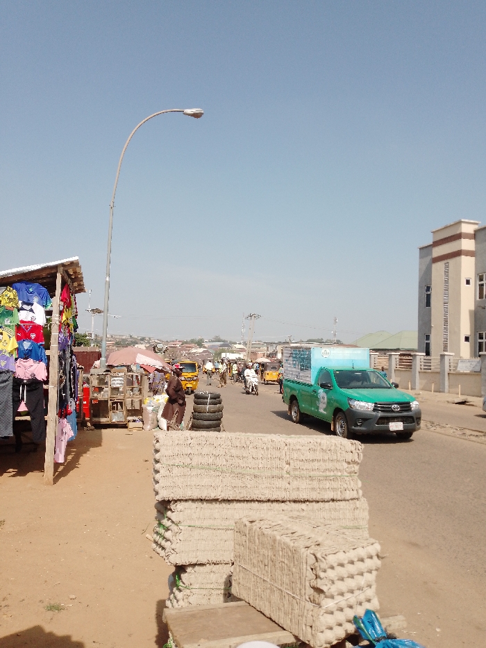 The image captures a sunny street scene in Tudun Nupawa, Nigeria, depicting a bustling commercial area