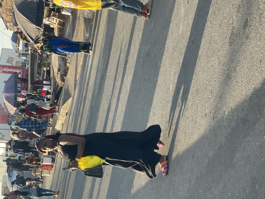 The image depicts an active street scene in Barakin Lerawi, Nigeria, under direct sunlight, evidenced by prominent, elongated shadows cast across the paved asphalt road. In the immediate foreground, a dark-skinned woman walks from right to left across the road, facing towards the viewer. She is dressed in a long, black, sleeveless maxi-dress and multi-colored flat sandals with pink and orange straps. Her dark hair, possibly in braids or extensions, is pulled back by a light-colored headband, revealing reddish-brown extensions. She carries a black handbag on her left arm and holds a bright yellow plastic bag in her left hand, along with a dark-colored smartphone. To the right of the primary subject, partially visible, a person stands facing away from the camera, wearing a yellow t-shirt featuring a "23" graphic, gray sweatpants, and orange and white sneakers. Beyond the paved road, separated by a concrete curb, is an unpaved area indicating a market or commercial zone. Multiple individuals are present here; one person in a blue, green, and orange patterned long dress walks away from the camera. Several vendor stalls with dark umbrellas provide shade, displaying goods. In the background, numerous people in diverse attire, including long dresses and casual clothing, are seen walking, standing, and interacting. Buildings are visible, one featuring a "Kilimanjaro" sign and a red banner. A motorcycle and a white vehicle are also present in the distant background.
