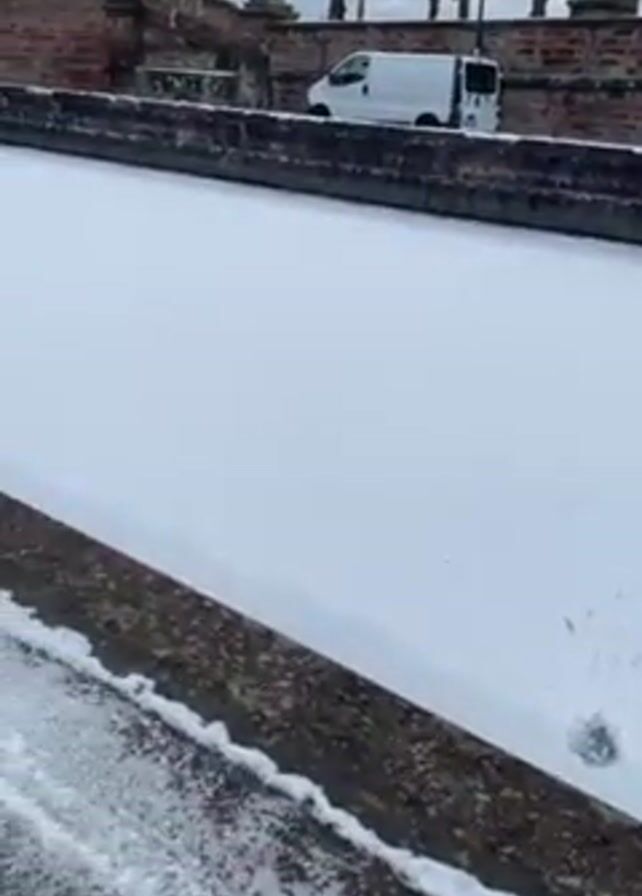 The camera pans across a frozen canal. The canal is lined with stone walls, which are dusted with snow. The water below is completely covered with a smooth layer of snow. Bare trees are visible in the background. A white van is parked on a higher level of the canal in the distance. The sky is overcast.