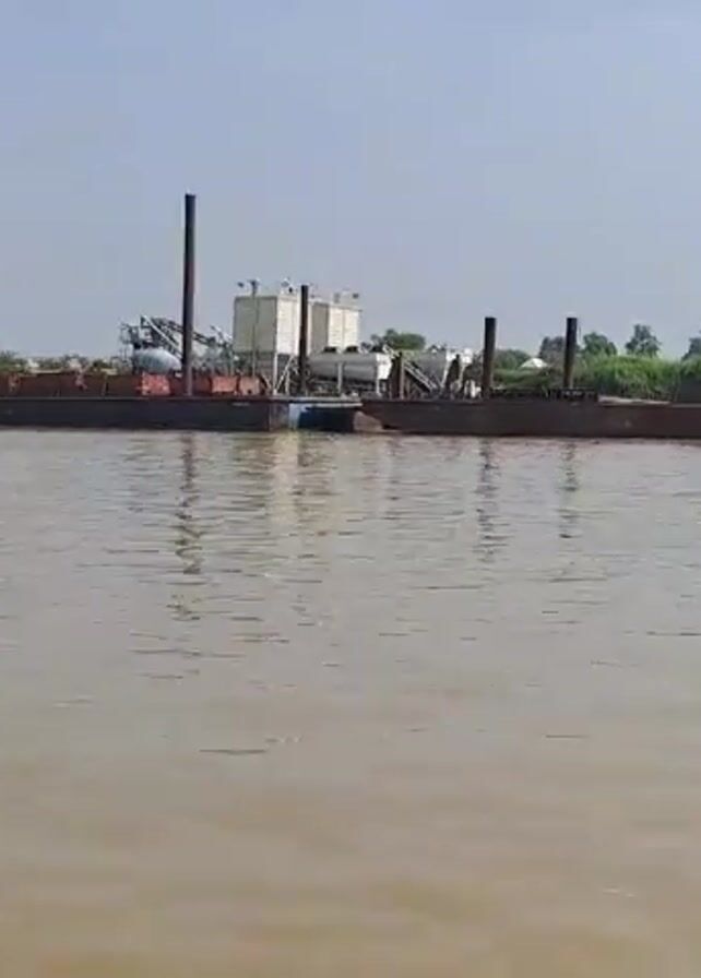 river landscape with a long barge and related construction equipment. The water is a murky brown. A crane is visible on the barge, as are several upright metal posts. A small structure and some parked vehicles are visible on the barge. On the shore, there is vegetation and possibly some buildings in the distance. The sky is a hazy blue. The video appears to be taken from a moving boat on the river. There is some indistinct speech or background noise audible in the video.
