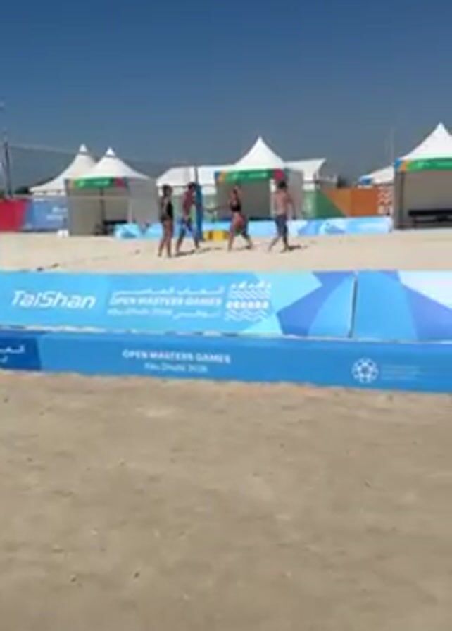 beach scene with various tents and barriers set up for an event, likely the Open Masters Games Abu Dhabi 2026