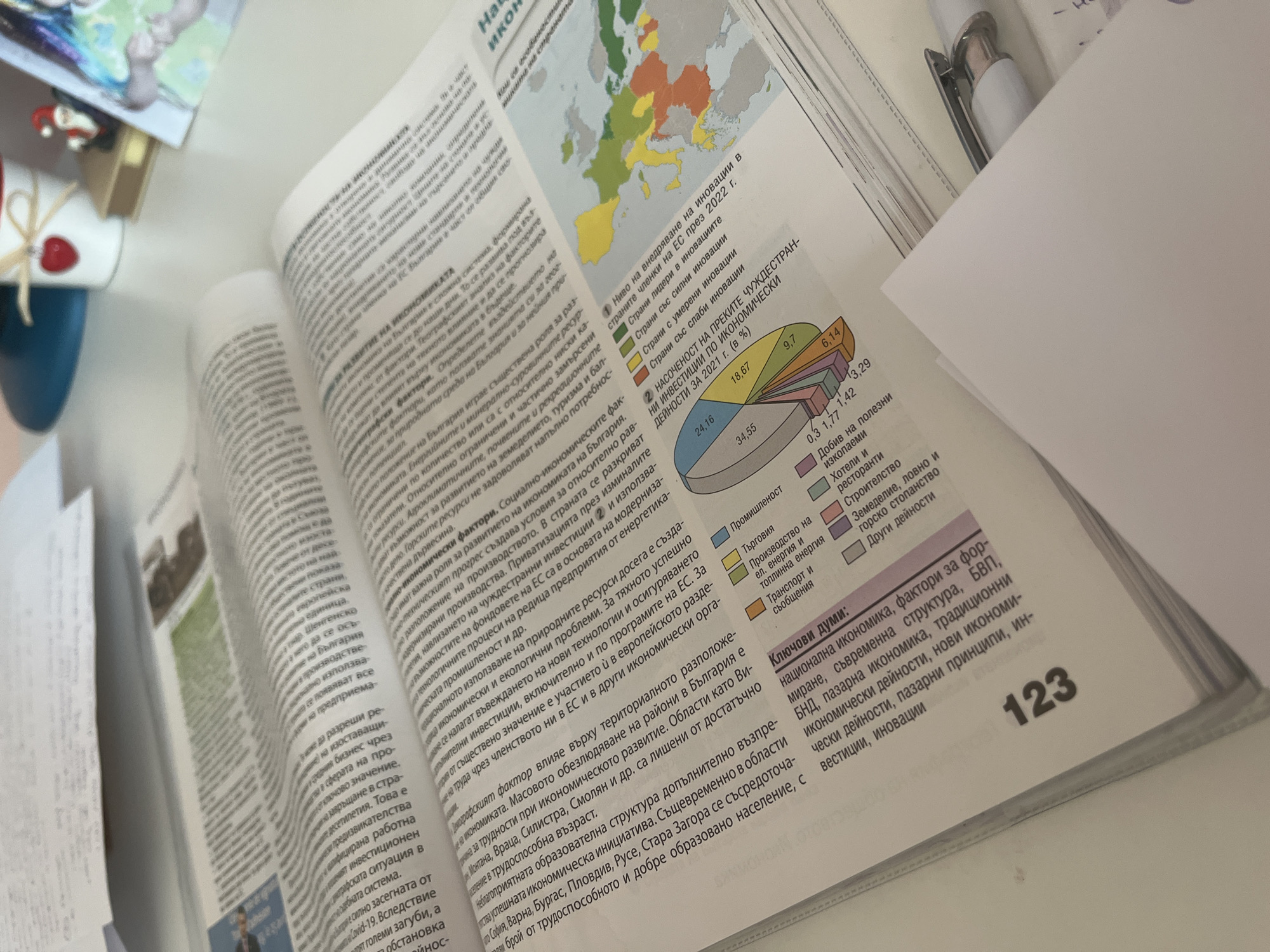 n open book on a light-colored surface. The book appears to be a textbook, with text in Bulgarian and a map of Europe showing different countries colored to indicate levels of innovation. There is also a pie chart illustrating the direction of foreign investments by economic activity in 2021. A pen and papers are also present in the image. The location in the city of Pernik, Bulgaria is not evident in the image.