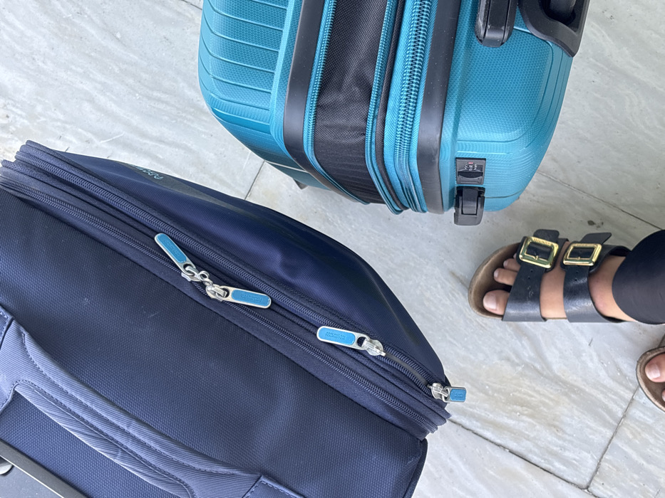 - "A top-down, slightly oblique view captures a person's left foot positioned between two pieces of luggage on a light-colored, subtly veined tile floor in Thermi, Greece" by FM-mfRp53, licensed under CC BY 4.0