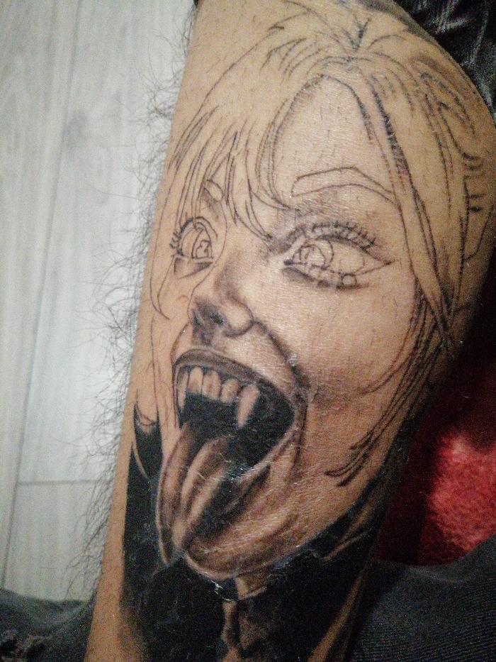 A close-up image depicts a partially completed tattoo on a human limb, covered with fine, dark hair, within an indoor setting in an unknown city. The tattoo portrays a stylized, anime-influenced female face with an exaggerated, screaming expression. Key features of the tattoo include wide-open eyes with outlined pupils and detailed eyelashes, an open mouth displaying prominent fangs and a long, protruding tongue. Shading in black and gray is applied to the lower face, mouth, and tongue, while the upper facial features and hair are delineated by line art only. The background on the left consists of a light-colored surface, possibly wood or tile, and on the right, a dark red, textured fabric. No other individuals or direct human interactions are visible.