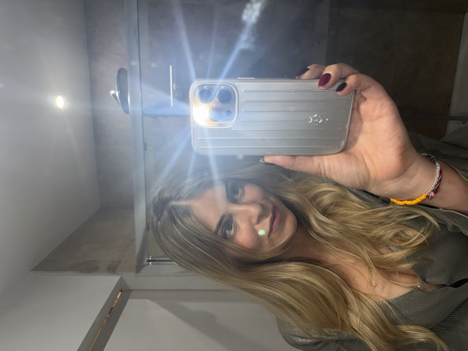 A woman with long, wavy blonde hair takes a selfie in a bathroom mirror. She holds a silver phone with a reflective case, its flash creating a glare. Her left hand is visible, revealing dark red nail polish and a colorful beaded bracelet. The bathroom features a chrome shower head and a modern design with beige and white tiling. The overall impression is a casual self-portrait in a brightly lit setting.
