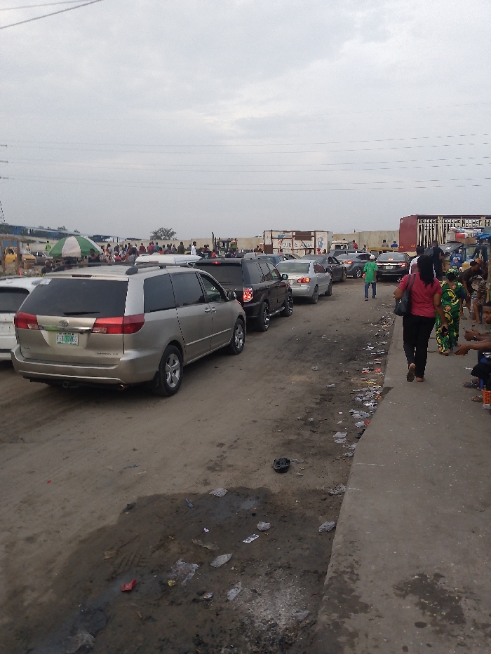 A row of cars sits on a dirt road, the first being a gold-colored minivan. A group of people stands to the left, some under a green umbrella. To the right, a woman in a pink shirt walks away from the camera. Other people stand or sit next to her. The ground is dirty with litter, and the sky is overcast. Power lines stretch across the horizon.