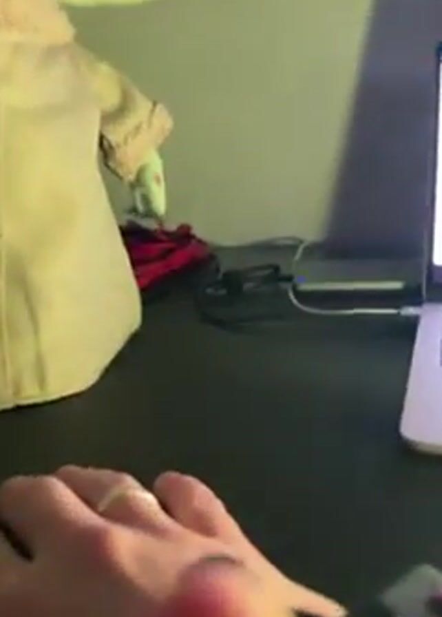 A person is sitting at a desk with a laptop and a "Baby Yoda" toy, operating a device on their wrist that causes the toy to make noises and move its arm. The camera focuses on the device and then on the toy, as the person activates the device, causing the toy to make a "goo goo gah gah" noise and raise its arm. The room is dimly lit, and the desk is cluttered with wires and other items.