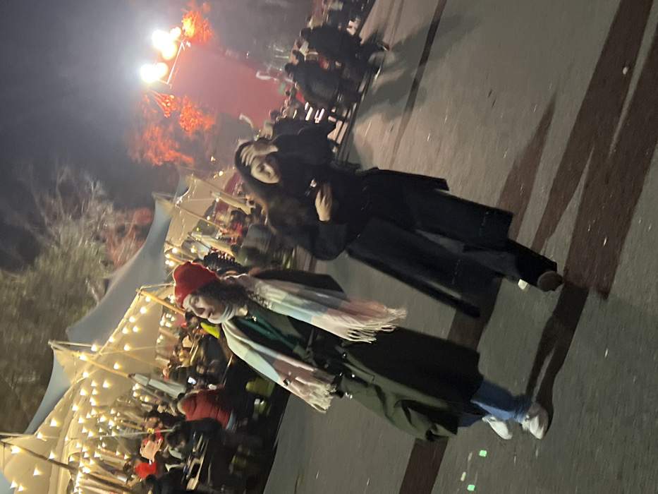 Two women stand on a paved surface at night. The first woman, wearing a red hat, a green coat, a multicolored scarf, and jeans, is facing forward. The second woman, dressed in all black, is looking at the camera, while touching her head. In the background, there's a large outdoor venue with white canopies and numerous people gathered under string lights. A red light or display is visible in the far background.