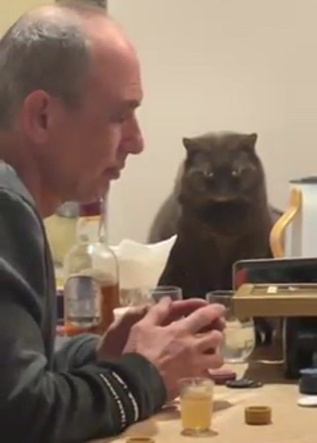 A middle-aged man with thinning hair is seated at a table with a small shot glass of amber liquid in front of him. He is wearing a grey sweatshirt. Next to the shot glass are round objects that appear to be poker chips. Behind him is a large, brown cat with a serious expression on its face. On the table there is also a bottle of liquor, a water glass, a box, and a white electric kettle. The background includes a patterned wall hanging and a white door. The man is talking, and the cat is watching him intently.