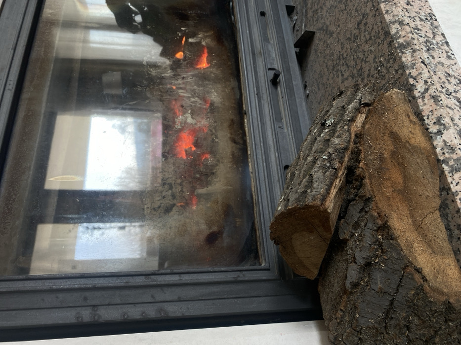 The scene depicts a closed-combustion fireplace or wood-burning stove located within a residence in Dobri dial, Bulgaria. The fireplace unit features a black metal frame enclosing a glass door. Visible through the smudged and sooted glass are glowing red embers, indicating a recent or ongoing fire. Reflections on the glass suggest an interior space with a window, possibly showing distant outdoor elements. In the immediate foreground, resting on a speckled granite hearth, are two pieces of split firewood. The logs display rough, dark bark and lighter, exposed wood from their cut surfaces. A white wall is partially visible to the left of the fireplace structure. No individuals are present.