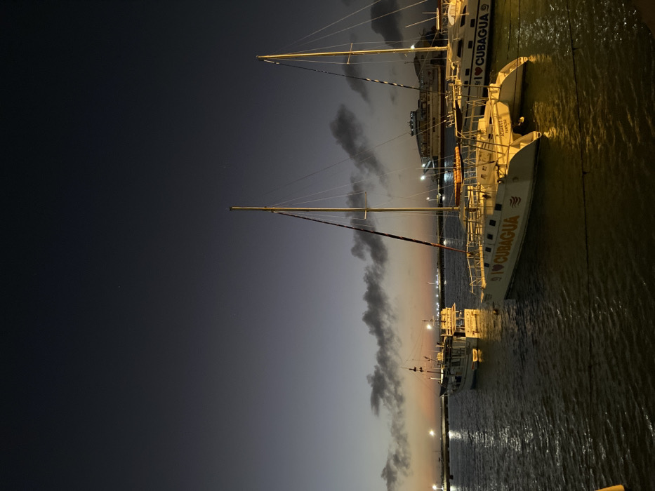 The image depicts a harbor scene in Punta de Piedras, Venezuela, at dusk or early night