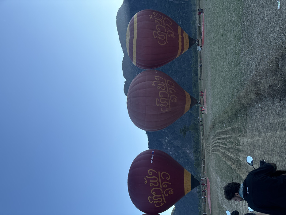 The image depicts an outdoor scene in Naka, Laos, under a clear, light blue sky. Three large hot air balloons, primarily maroon in color, are positioned upright in a flat, dry grassy field. Each balloon displays yellow Lao script, "ເມືອງຟ້າ ລາວ" (Muang Fa Lao), on its side. The balloon on the far left also features the alphanumeric designation "BBH-3415A" and is partially cropped. The balloon on the far right has additional horizontal yellow stripes near its top. Each balloon rests on a distinct red ground cover or tarp. Small groups of individuals are visible near the base of each balloon, consistent with ground crew or passengers preparing for launch. In the immediate foreground, the back of a person wearing a dark jacket and a blue and white scarf is visible, seated on a scooter or motorcycle, facing towards the balloons. The ground between the foreground and the balloons shows prominent tire tracks. Dark green, tree-covered karst mountains rise in the background under the clear sky.