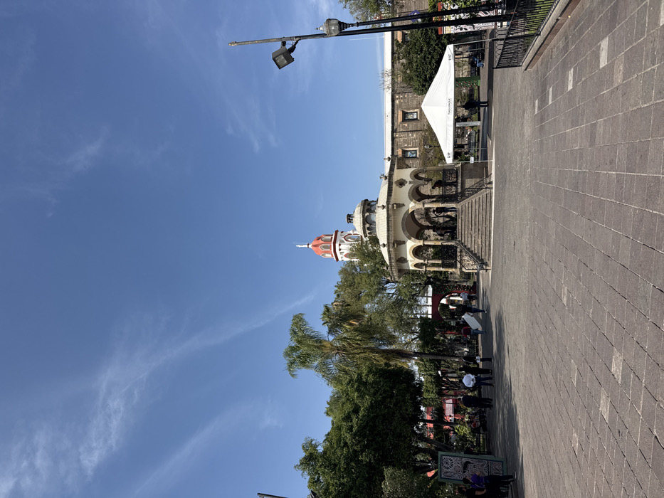 A scene features a tiled walkway and a partly visible building with arched structures and stairs leading up to it. The building is topped with a dome that has a red roof. There's a white tent-like structure beside the building. A street light with a spotlight faces towards the right of the image. In the background, green trees contrast with a bright blue sky dotted with wispy clouds. People are present near the walkway.
