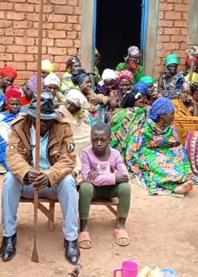 gathering of people outside a brick building. The people are mostly women, sitting on the ground or on small stools. There are a few men standing and sitting among them. One man is speaking, pointing with his right hand. In front of the seated people, on the ground, are some items including a jug, a plate, and a carved wooden figure. The scene appears to be taking place in a rural or village setting. The atmosphere appears to be somewhat formal or ceremonial.