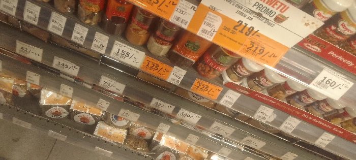 The image displays an interior retail scene within a supermarket or grocery store in Viwandani ward, Kenya. Multiple horizontal shelves, with clear plastic or glass fronts, are stocked with various packaged food products. The shelves are observed from a slightly elevated, downward-angled perspective. The uppermost visible shelves feature numerous jars of spices and seasonings, including products labeled "Black Pepper," "Seasoned Tripe," and "Nature's Own Lemon Garlic Spices." Prominent orange promotional tags are visible, with one advertising a "PROMO" for "OWN LEMON GARLIC SPICES" at "219/-". Other price tags, both white and orange, display values in Kenyan Shillings, such as 155/-, 125/-, 42/-, 145/-, 75/-, 190/-, 135/-, 120/-, 70/-, and 160/-. Lower shelves contain individually wrapped, small, round items, some featuring a "Cottage" brand logo with a sun graphic. The environment is brightly lit, indicative of a commercial retail setting. No individuals are present in the frame.