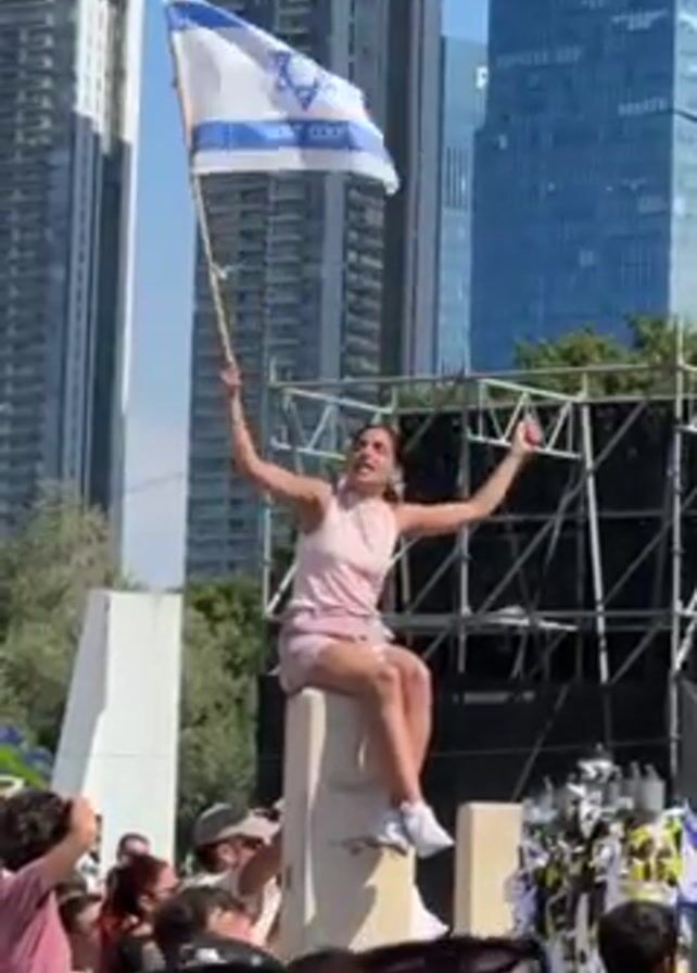 Here's a detailed description of the video: The video shows a woman sitting atop a pillar or monument in a public square. She is holding an Israeli flag, which is waving in the wind. She has her arms raised and is facing the crowd. She is wearing a pink tank top and shorts and white sneakers. The crowd is gathered around the pillar, looking at her. Some people are taking photos or videos with their phones. In the background, there are tall buildings and what appears to be a stage. The sky is clear and blue, and it appears to be a sunny day.