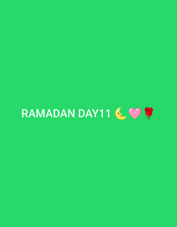The image displays a solid, bright green background. Centered horizontally, slightly above the vertical midpoint, white capital letters spell "RAMADAN DAY11." To the right of this text, in a horizontal sequence, are three emojis: a yellow crescent moon with a smiling face, followed by a solid pink heart, and then a red rose. There are no people, specific objects other than the text and emojis, or actions depicted. The location in the city of Unknown, Unknown, is not discernable from the image content.