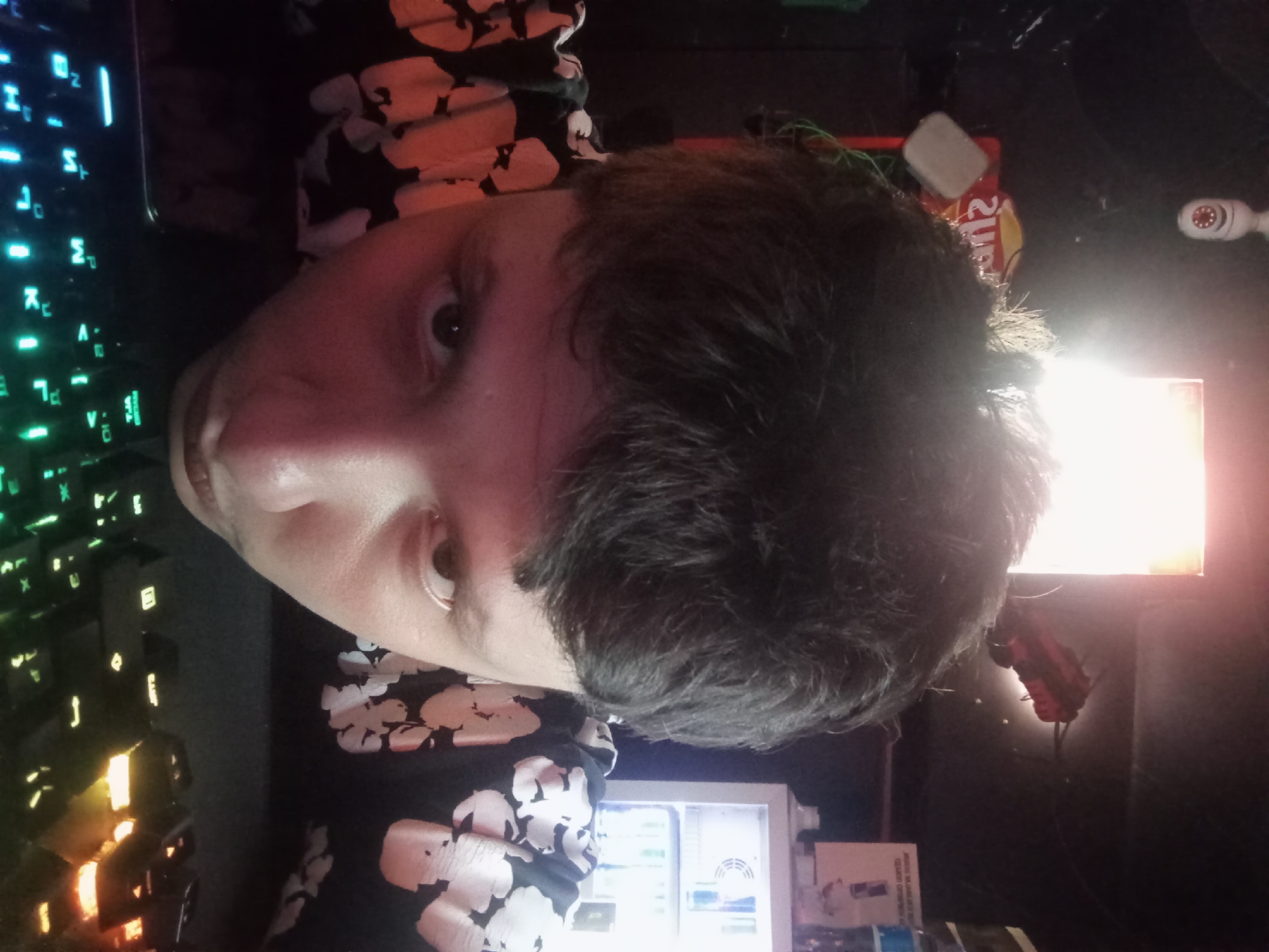 An individual is captured in a close-up, low-angle shot, leaning forward over a desk or counter. The subject has short, dark hair and wears a dark shirt with a white floral pattern. Their face, partially visible from the nose upwards, gazes directly into the camera. A multi-colored backlit keyboard, displaying green, blue, and orange illumination, occupies the lower foreground. A dark object, possibly a smartphone, rests beside the keyboard. The background is dimly lit with a strong, bright light source emanating from the upper center. To the upper left, a white CCTV camera is mounted, with a partially visible red object, possibly a "2UP" snack bag, and a white rectangular item below it. To the upper right, a small red object, resembling a toy car, is affixed to the wall. A small, white, glass-fronted beverage cooler with visible bottles is present on the right, topped by a water bottle and a paper sign. The walls are dark. The scene depicts an indoor environment, likely a commercial establishment such as a gaming cafe or a small shop, situated in Tashkent, Uzbekistan.