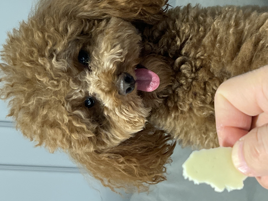 A fluffy, brown poodle with dark eyes and a pink tongue hanging out is shown at an angle. A hand holds a small, irregular piece of pale yellow cheese near the dog's mouth. The background is a plain, light color. The dog's fur is curly and covers most of its face.