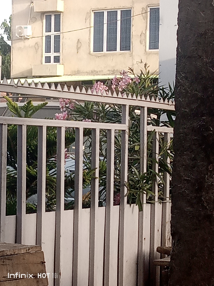 This image presents a static outdoor scene within the city of Katsina, Nigeria, in the vicinity of Muhammadu Dikko Stadium. The foreground on the lower left displays a partial view of a wooden object, marked with an "Infinix HOT 10i" watermark. A grey and white metal fence, composed of vertical slats and topped with a continuous row of triangular spikes, occupies the mid-ground. Behind this fence, various green plants are visible, interspersed with clusters of pink flowers, consistent with oleander. A dark, textured tree trunk, possibly a palm, partially frames the right side of the image. The background features a light-colored, multi-story building with a rough, possibly unpainted concrete facade. This building includes a vertical stack of four rectangular windows with white frames on its left side, above which an outdoor air conditioning unit is mounted. To the right, a wider window unit containing three vertical panes, also with white frames and apparent security grilles, is visible, along with a partially obscured smaller vertical window further right. No human figures or specific activities are present.