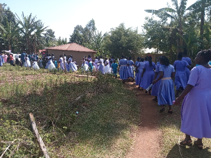 A large group of people, mostly women and girls, are walking along a dirt path. Many are wearing matching light blue dresses with sashes, while others in the group wear white dresses. A modest, single-story dwelling with a rusty brown roof sits in the background amidst lush green vegetation and tall trees. The foreground features overgrown grass and a rustic fence post. The sky is bright and sunny, casting a warm glow over the scene.