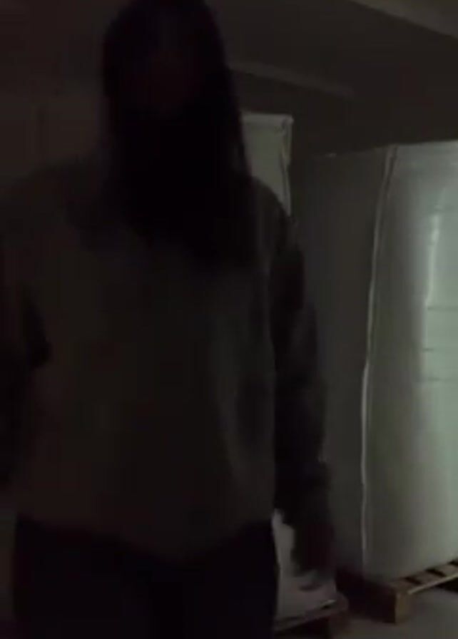A dimly lit room contains two large, white, square bags resting on wooden pallets. A person with long dark hair, wearing a grey hooded sweatshirt and dark pants, approaches one of the bags and extends their arm towards it. Another person, wearing a dark jacket, then approaches and embraces the first person in front of the bag.