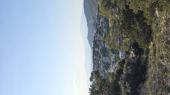 An elevated, panoramic view depicts a coastal settlement within the Salamina Municipal Unit, Greece. The foreground consists of dry, rocky terrain interspersed with low green shrubs and sparse vegetation. The midground reveals a residential area composed of numerous white or light-colored buildings, many with red-tiled roofs, densely integrated with green trees and foliage. Behind the settlement, a calm, blue body of water extends towards a distant coastline. The background features successive layers of hazy blue hills and mountains under a clear, light blue sky with minimal cloud cover. No people, specific actions, or interactions are visible in the static scene, which is illuminated by bright daylight.