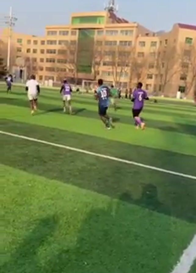 Several people are running on a green turf field. They are wearing athletic clothing. There are buildings visible in the background. The camera is moving and focused on the ground.