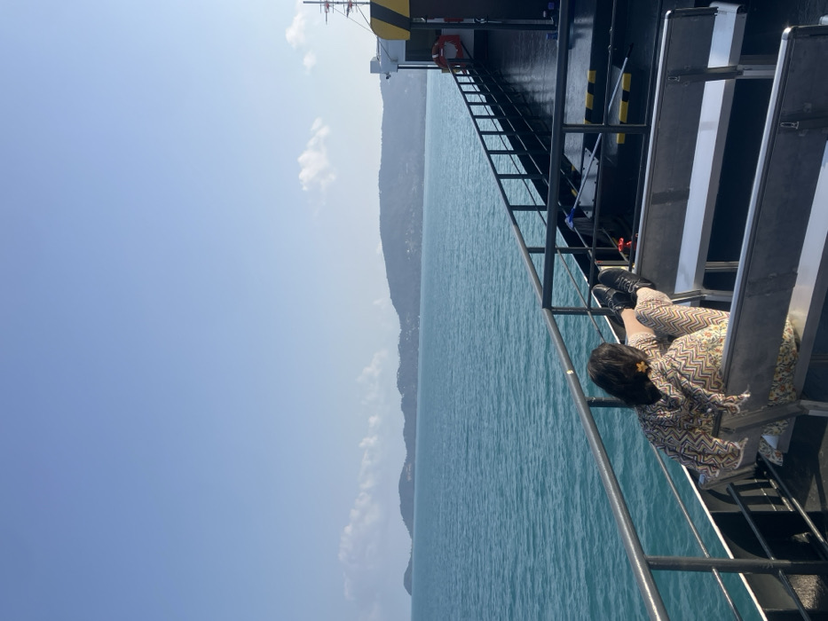 The image depicts a scene from the deck of a vessel, identified as being in the vicinity of Tong Yang, Thailand. The environment features a clear, bright blue sky with sparse, wispy white clouds visible along the horizon. An expansive body of calm, turquoise-blue water occupies the midground and left portion of the frame. In the distance, a series of lush, green, tree-covered islands or coastal hills are visible across the water, showing subtle signs of human habitation. In the foreground, the dark grey deck of a ferry or similar large boat is visible. A metallic railing, composed of a handrail and horizontal bars, extends along the left edge of the deck, curving towards the vessel's front. A single individual is seated on a light grey metallic bench, part of a row of similar seating, positioned with their back to the camera. This person is looking out towards the water and the distant landmass, with their legs propped up on the railing. They wear a light-colored outfit with a distinct yellow, brown, and white geometric or zigzag pattern, and dark, closed-toe shoes. Dark hair, possibly pulled back, is visible, adorned with a yellow flower or accessory on the right side of the head. To the right of the scene, a section of the vessel's superstructure is visible, featuring yellow and black striped safety markings on the deck, a red life preserver ring hanging on a white wall, and parts of a mast or antenna structure. The overall scene suggests a daytime setting with pleasant weather, likely during a sea voyage.