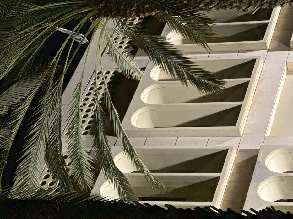 The image displays a section of the illuminated exterior facade of the Great Synagogue of Tel Aviv, located on Allenby Street in Tel Aviv, Israel, observed at night. The light-colored building features multiple levels of arched architectural elements. The lower visible level presents a series of smaller, rounded arches, while the upper visible level exhibits taller, deeply recessed arches where upward artificial lighting casts prominent, sharp, triangular shadows. Above this series of arches, a decorative horizontal band contains rows of circular perforations. In the upper right corner, a portion of a light-colored flag with a visible blue stripe, consistent with the flag of Israel, is visible against a dark background. The scene is partially framed and obscured by the dark fronds and trunks of two palm trees, one on the far right and another on the far left. No individuals or active subjects are present.