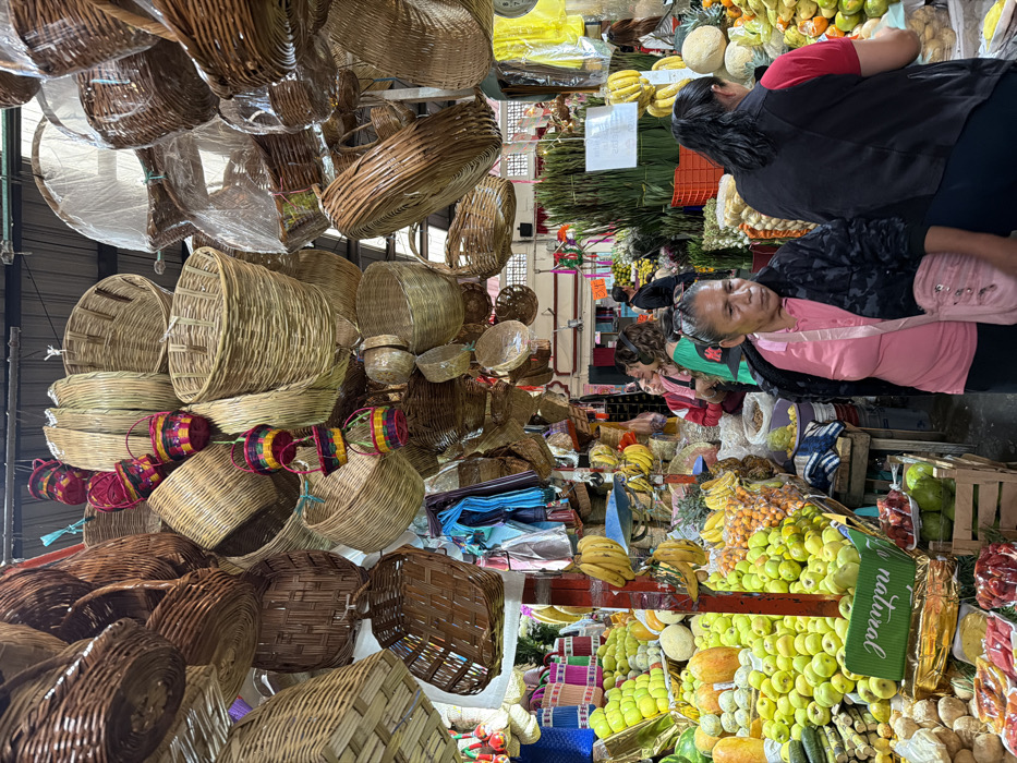 A bustling marketplace scene features an abundance of goods. Baskets in various sizes and shades of brown hang overhead, while fruits like apples and bananas are displayed below. Several customers browse the stalls, including one woman in a pink shirt and another in black. Additional items such as flowers, vegetables, and fabric add to the crowded and vibrant atmosphere.