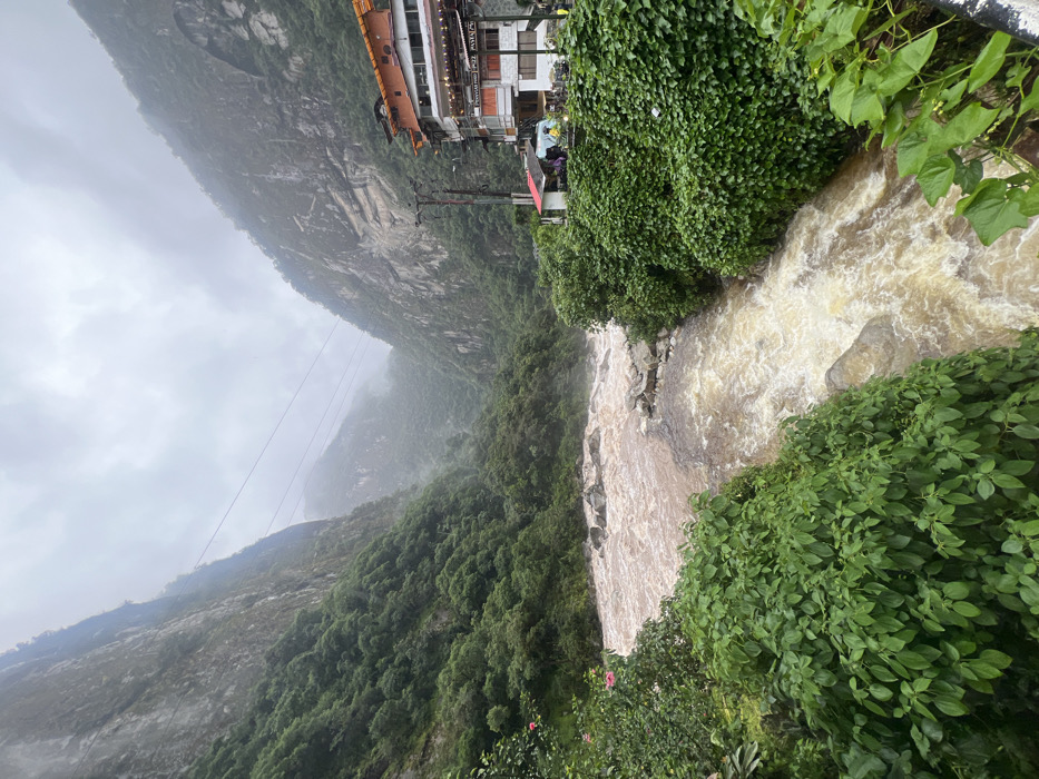 A muddy river rushes through a steep, lush valley. Buildings are precariously perched on the edge of the cliff overlooking the torrent. Mist and rain obscure the tops of the mountains that loom on either side. The vegetation is abundant, with green bushes and trees crowding the landscape. A few utility lines are visible across the valley. The overall atmosphere is wet and rugged.