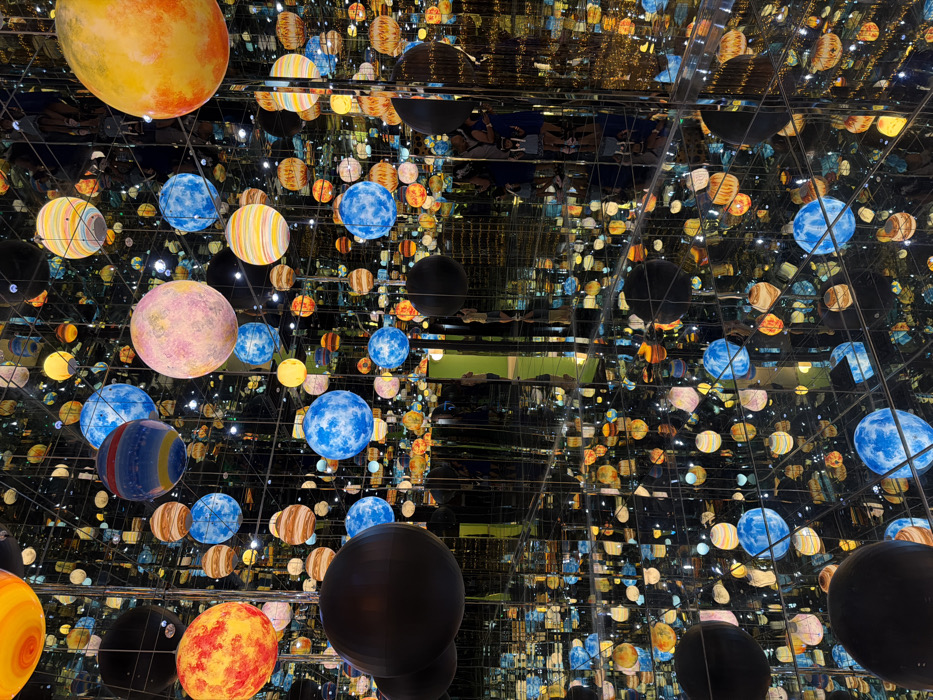 The image displays an immersive art installation located at the Moda Gallery Bangkok (Museum of Digital Art Bangkok) within ICONSIAM, Bangkok, Thailand. The scene is an infinity room characterized by mirrored walls, floor, and ceiling, creating an illusion of boundless space. Numerous spherical objects, varying in size, color, and pattern, are suspended throughout, representing celestial bodies such as planets and moons. These objects are illuminated, featuring distinct patterns including mottled blues and whites, fiery oranges and yellows, pastel pinks and purples, multi-colored horizontal stripes, and solid black. Several individuals are present, observed through reflections within the mirrored surfaces. On the right side, a group consisting of at least three people—two adults and one child—is visible standing, facing into the installation. Additional solitary figures appear in reflections further back and to the left. All individuals are passively observing the illuminated, expansive environment.