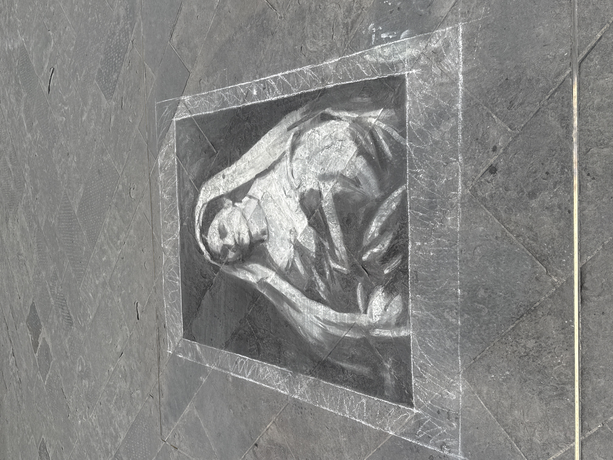 An overhead view captures a large, monochrome chalk drawing on dark gray stone pavement in Florence, Italy. The artwork depicts the upper body of a woman, rendered in white and light gray chalk, wearing a head covering that drapes over her shoulders and torso. Her gaze is directed slightly upward and to the viewer's left. Her left arm cradles a form suggestive of an infant or a wrapped bundle held close to her chest. The drawing is contained within a rectangular frame formed by hand-drawn white chalk lines, with additional chalk marks visible around its perimeter, particularly on the left side. The pavement consists of numerous irregularly shaped, dark gray stone slabs with visible texture and wear. A thin, light-colored linear object, appearing to be a wooden stick or ruler, rests horizontally across the bottom edge of the image, partially overlapping the lower portion of the chalk frame. The scene is brightly illuminated, indicating daylight.