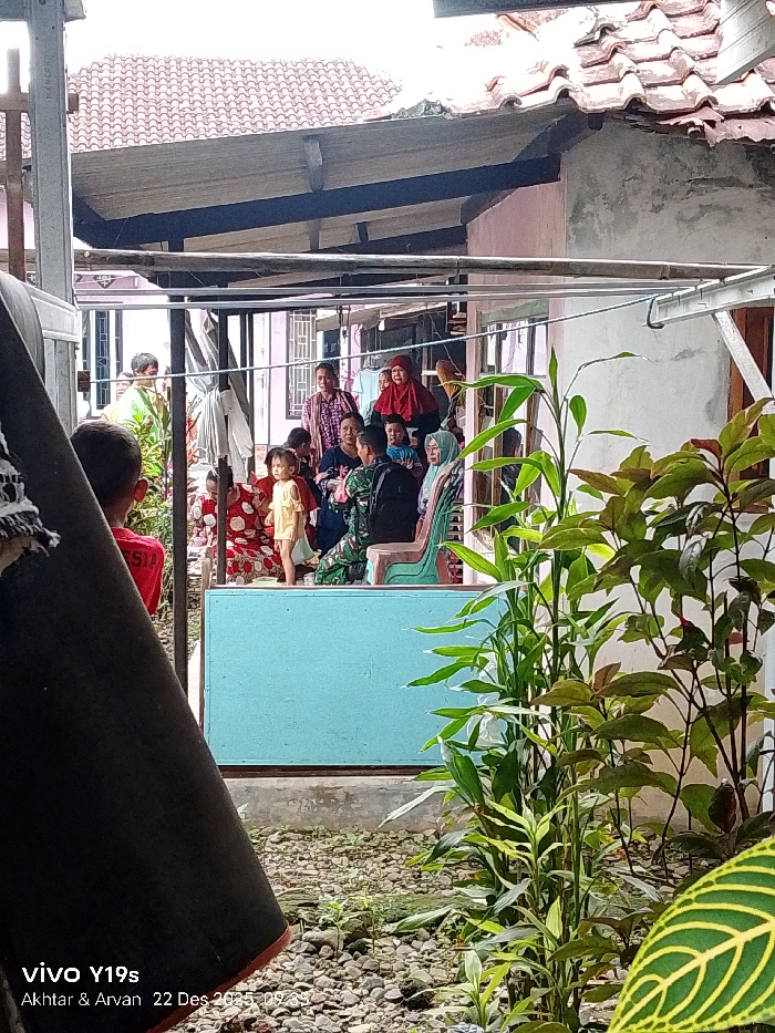 A group of people gathers outside a house. There are several adults and children present, some sitting on chairs, others standing. A young child in a yellow dress stands at the edge of a raised blue platform. The background includes the roof of a building and a partially visible clothesline. Lush greenery obscures parts of the scene. A portion of a mobile phone, its model name and date are visible on the bottom left corner of the image.