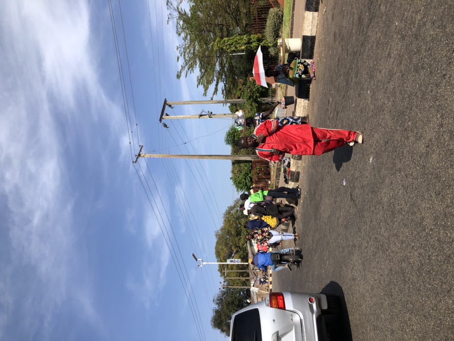 The image depicts a bustling street scene in Barakin Lerawi, Nigeria, under a clear blue sky with sparse, wispy clouds