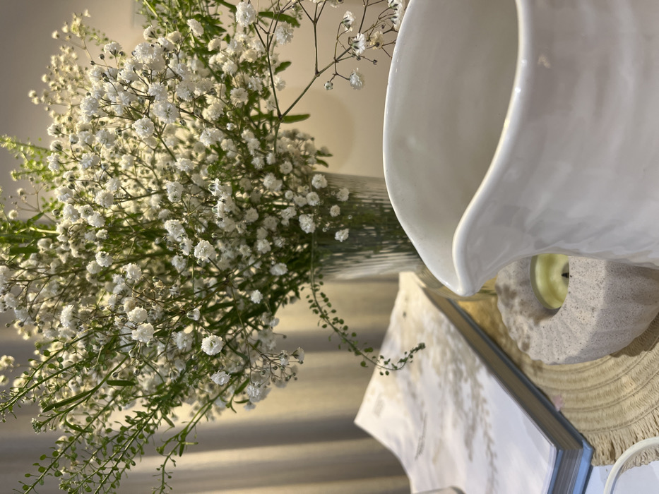 A close-up shot showcases a vase filled with delicate baby's breath flowers. The flowers are white and abundant, contrasting with their green stems. A white ceramic pitcher dominates the upper right, partially obscuring a candle and a book. The scene is bathed in soft, natural light, highlighting textures and creating a serene ambiance.