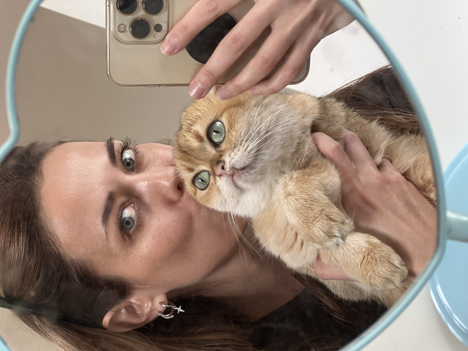 A selfie captured in Bar, Montenegro, depicts a woman and a cat reflected in a light blue, heart-shaped mirror. The woman, positioned on the left, has light brown hair and wide blue-green eyes. She wears silver hoop earrings, one featuring a star charm, on her left ear. Her lips are pursed towards the golden-furred Scottish Fold cat, which she cradles with her left arm. The cat, with prominent green eyes, looks slightly upwards. The woman's right hand holds a light gold smartphone, identifiable by its triple camera array and a black circular grip accessory, indicating she is taking the photograph. The background behind the subjects appears to be a light-colored wall and a flat surface.