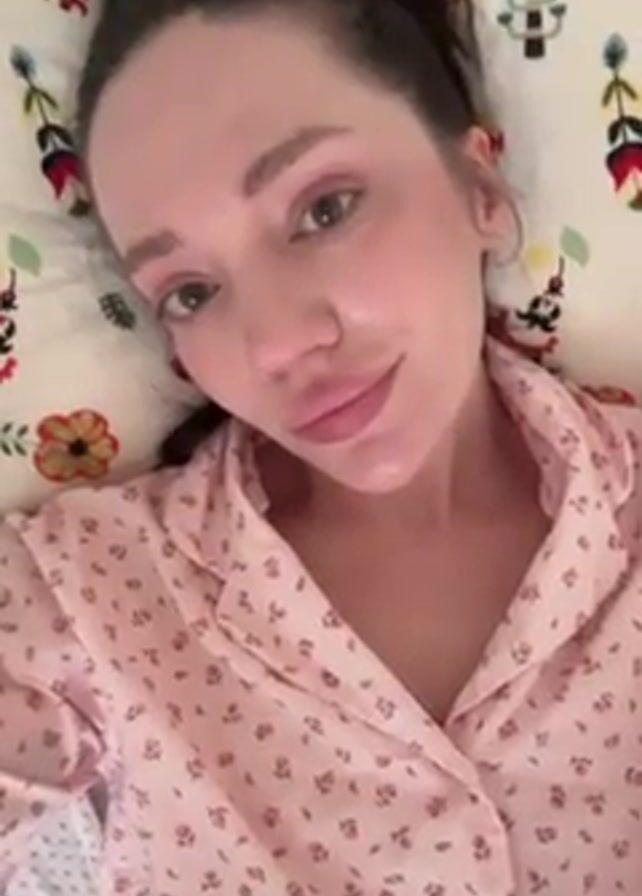A woman with dark hair in a bun is lying in bed, wearing pink floral pajamas