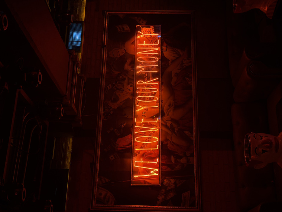 A vertical neon sign in a dark room reads "WE LOVE YOUR MONEY" in bright orange letters