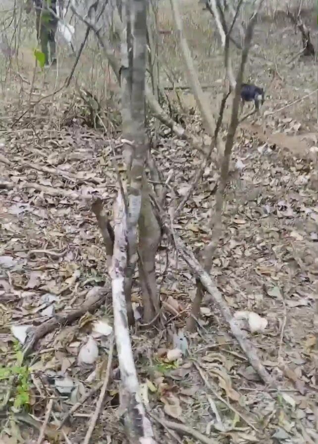 A dog and a person are seen walking in a wooded area. The ground is covered in dead leaves and branches. There are several small, bare trees with green leaves visible on some branches. The person is wearing dark clothing and is carrying a white plastic bag. The dog is small and dark colored. The person is walking behind the dog. The video is taken from a first-person perspective.