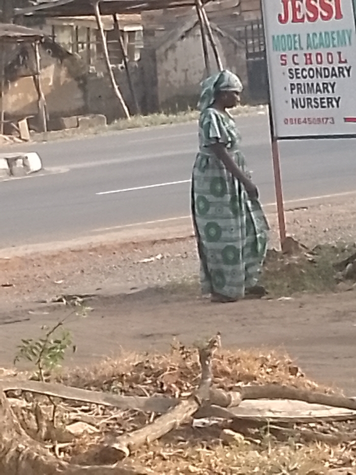 A woman wearing a patterned green dress and head covering stands on the side of a road. She is next to a sign advertising Jessi Model Academy, a school for nursery through secondary education. A phone number is visible on the sign. The road is beside a dirt area with sparse vegetation and fallen branches. In the background, buildings are visible across the road. The lighting suggests a daytime setting with slightly hazy conditions.