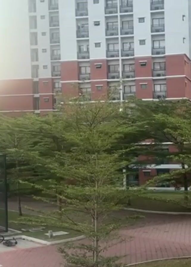 tall residential building with white and red brick exteriors. A line of green trees is visible in front of the building, obscuring the lower floors. A paved area with red bricks and green grass is in the foreground. A glimpse of a black fence and a bicycle on the ground can be seen on the left side of the frame. The scene is brightly lit, suggesting daylight.