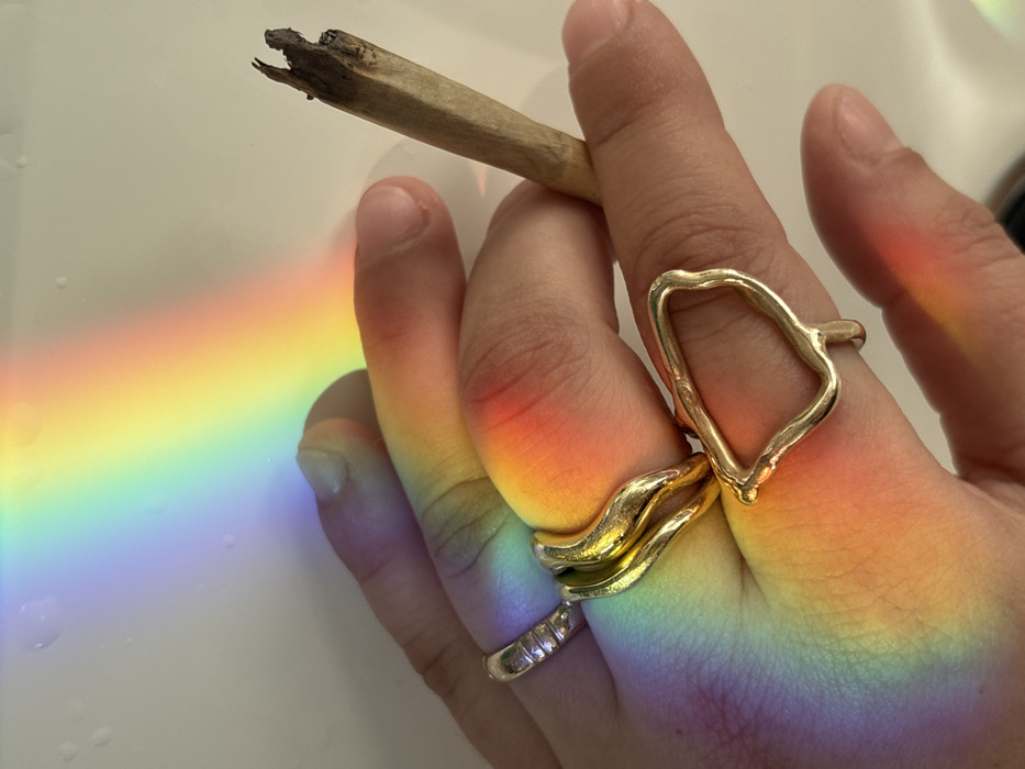A close-up image depicts a human left hand, fingers slightly curled, set against a plain, light-colored background with visible water droplets. A prominent rainbow spectrum of light is projected across the hand and the background. The hand holds a hand-rolled cigarette, exhibiting a burnt, dark ash tip, positioned between the index and middle fingers. The ring finger displays two gold-colored rings: a textured band and a multi-strand design. The middle finger wears a large, irregularly shaped, open-frame gold-colored ring. This scene is located in the city of Ramat HaSharon, Israel.