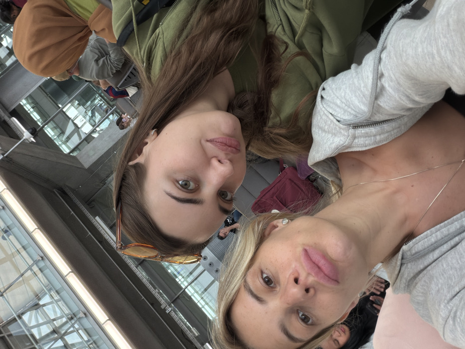 Two women are in the foreground, one with long brown hair, green eyes, wearing a green jacket and a pair of sunglasses. The other one has blond hair, light eyes, and a grey jacket. Both are posing closely in what appears to be an airport, with numerous people visible in the background, along with chairs and a large window.
