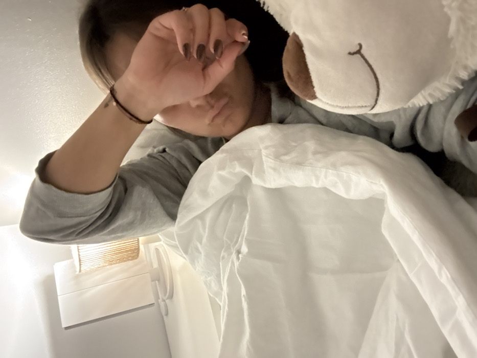 A person is in bed, seemingly shielding their eyes with their hand. They have painted nails and a bracelet on their wrist. A stuffed animal is nestled close to them, its smiling face visible. Crisp white bedding surrounds them. A white bedside table with a lamp is situated behind them, to the left. The scene is warmly lit, suggesting a cozy indoor setting.