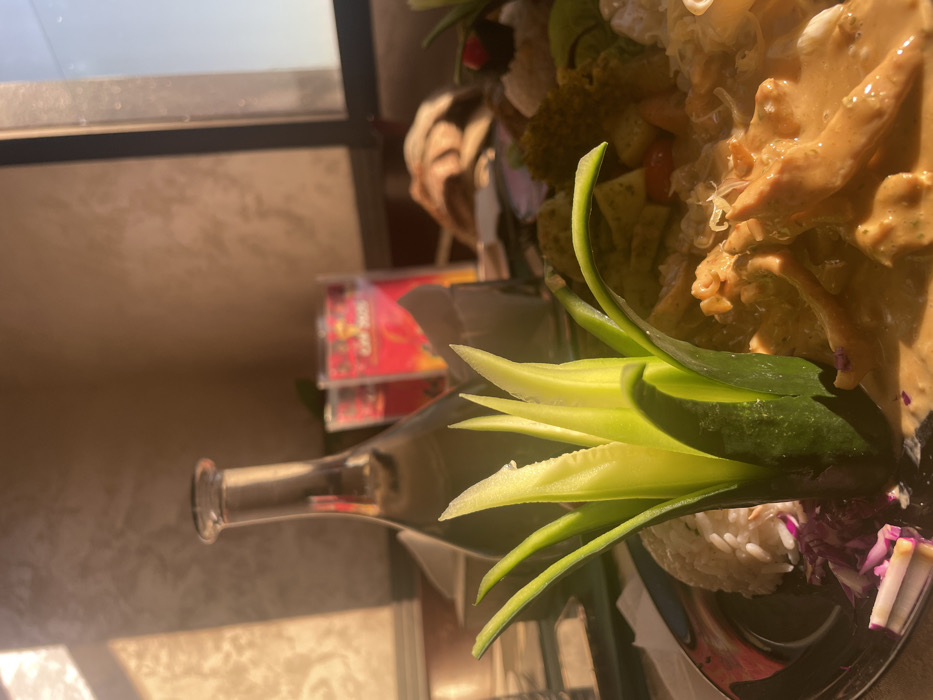 The image depicts a close-up, elevated view of a prepared meal presented on a black, reflective plate, illuminated by strong, warm sunlight originating from the right. The setting is an indoor environment, consistent with a restaurant or cafe in the city of Lkheng, Morocco; specific establishment identification is not visually determinable from the image. In the foreground, a prominently featured, elaborately carved light-green vegetable, consistent with a cucumber, stands upright on the plate, fashioned into a multi-layered, pointed floral or plant-like design. To the immediate left of this carving, a spherical mound of white rice is present, accompanied by finely shredded purple cabbage and thin white vegetable strips. To the right of the carved vegetable, the main course consists of multiple elongated pieces of pale orange-colored meat, consistent with chicken, thoroughly coated in a thick, creamy, orange-hued sauce. Fine white strands, possibly sautéed onions or rice vermicelli, are sparsely distributed over the sauced meat. Other food items, including green broccoli florets and small, red, indeterminate elements, are visible further back on the plate, partially obscured. In the midground, positioned behind the meal, a clear, empty glass bottle or decanter with a narrow neck stands upright. Adjacent to and behind this bottle, two upright red menu cards or flyers are visible, featuring white text, potentially "CAFÉ" or an establishment name, against their red background. The background on the left side of the frame displays a textured, light brown wall, exhibiting a distinct rectangular shadow cast by a window frame. On the right, a large window reveals a bright, clear blue sky, indicating daytime conditions. No individuals are present within the frame, and no explicit actions or interactions are depicted.