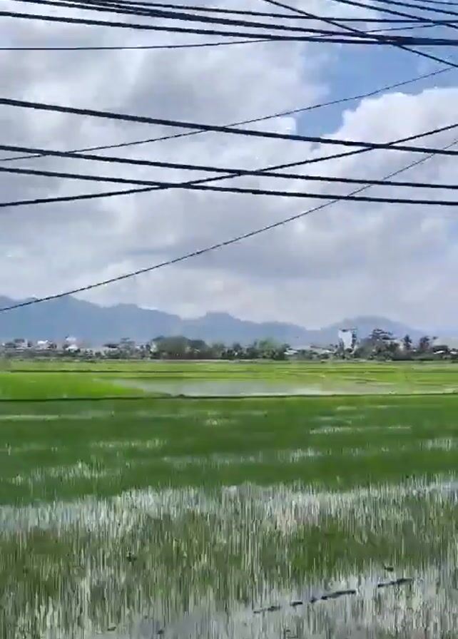 rural landscape. In the foreground, a utility pole stands with wires crisscrossing the sky. A coil of black cable is attached to the pole. The middle ground features a vast expanse of flooded rice paddies, the young rice plants creating a vibrant green carpet. Water reflects the sky, adding to the tranquility. In the distance, buildings and mountains add depth to the vista under a sky punctuated by scattered white clouds. The camera pans slightly, revealing more of the paddy fields and a small dirt path alongside. The video appears to be shot from a moving vehicle.