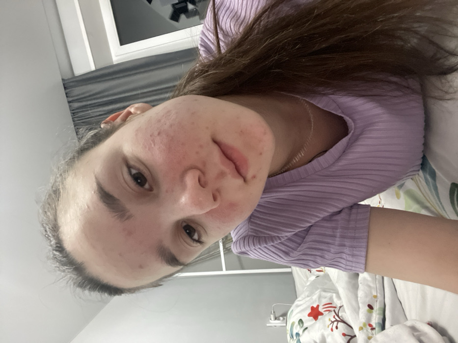 The image displays a close-up portrait of a young female, likely in her late teens or early twenties, with long, dark brown hair and light brown eyes. She is wearing a light purple, ribbed short-sleeved top and a thin, silver-colored necklace. Her skin presents multiple blemishes consistent with acne, particularly on her forehead, cheeks, and chin. Her head is tilted slightly to her left, and she looks directly at the camera with a neutral expression. The background indicates an indoor residential environment. To the left, part of a white bed sheet or duvet with red and green patterns is visible. A light gray wall behind her features a white power outlet with a white cable plugged in, and a partial white vertical structure. To the right, a dark gray curtain is drawn, partially obscuring a white window frame. The specific location within the city of Chaikovsky, Russia, cannot be determined from the visual evidence in the image.